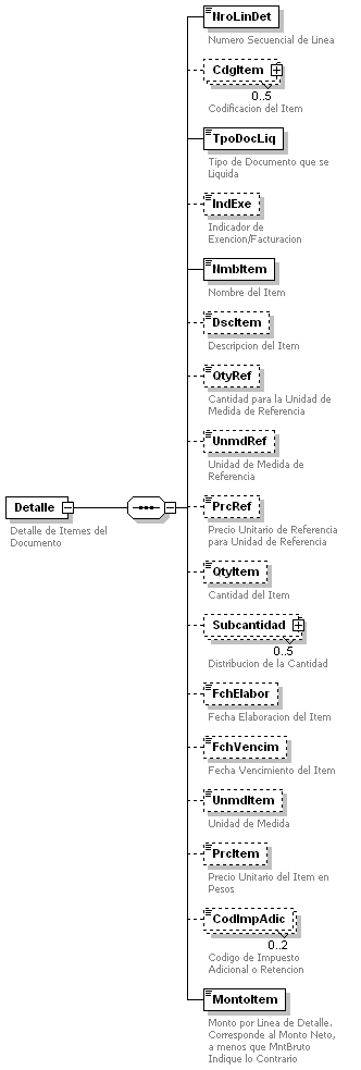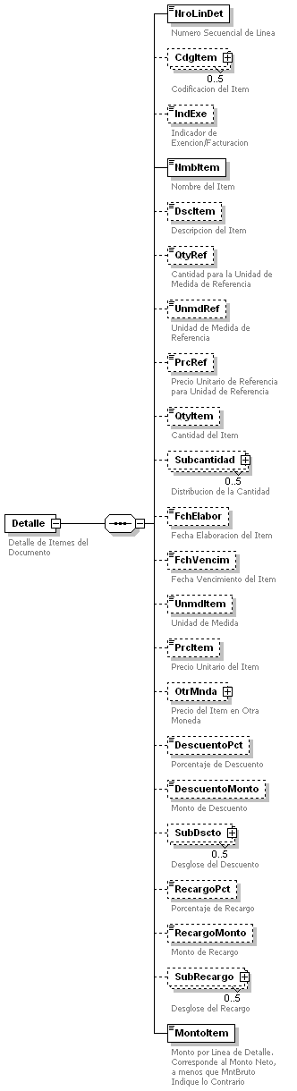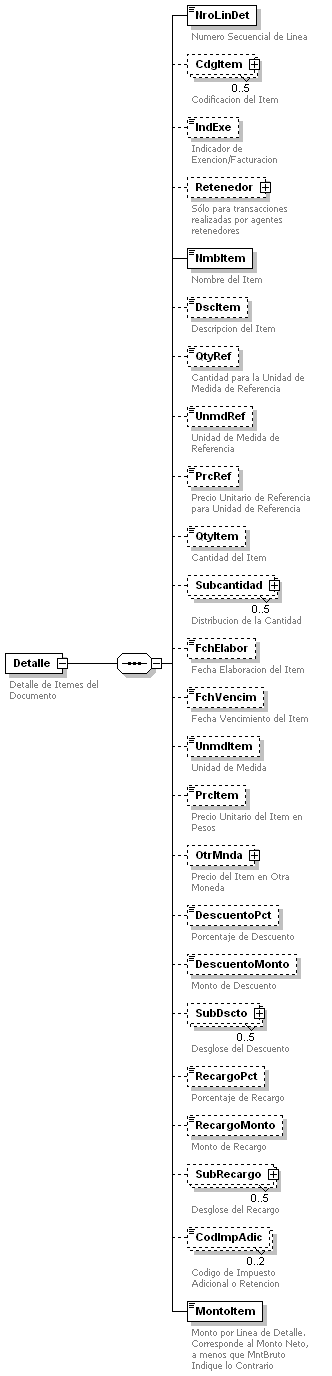 | children | NroLinDet CdgItem IndExe Retenedor NmbItem DscItem QtyRef UnmdRef PrcRef QtyItem Subcantidad FchElabor FchVencim UnmdItem PrcItem OtrMnda DescuentoPct DescuentoMonto SubDscto RecargoPct RecargoMonto SubRecargo CodImpAdic MontoItem | ||