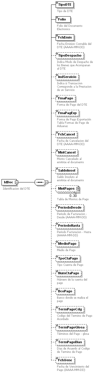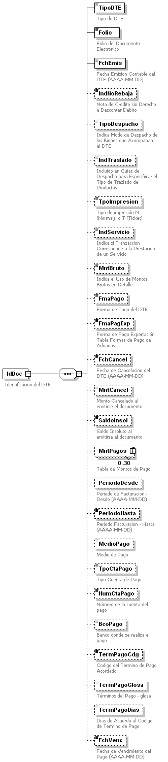 | children | TipoDTE Folio FchEmis IndNoRebaja TipoDespacho IndTraslado TpoImpresion IndServicio MntBruto FmaPago FmaPagExp FchCancel MntCancel SaldoInsol MntPagos PeriodoDesde PeriodoHasta MedioPago TpoCtaPago NumCtaPago BcoPago TermPagoCdg TermPagoGlosa TermPagoDias FchVenc | ||
