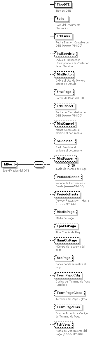| children | TipoDTE Folio FchEmis IndServicio MntBruto FmaPago FchCancel MntCancel SaldoInsol MntPagos PeriodoDesde PeriodoHasta MedioPago TpoCtaPago NumCtaPago BcoPago TermPagoCdg TermPagoGlosa TermPagoDias FchVenc | ||