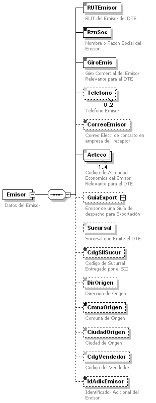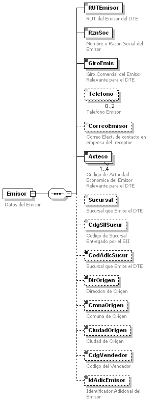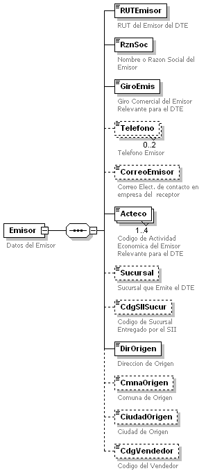 | children | RUTEmisor RznSoc GiroEmis Telefono CorreoEmisor Acteco Sucursal CdgSIISucur CodAdicSucur DirOrigen CmnaOrigen CiudadOrigen CdgVendedor IdAdicEmisor | ||